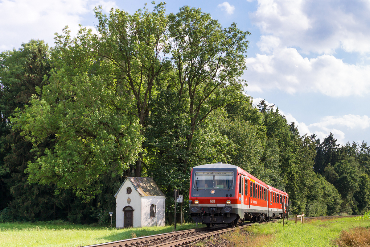 Nur vier Mal wochentags verkehrt ein Zug auf der Traun-Alz-Bahn (KBS 947). Hier ist es 628 593-6, der von Traunreut über Hörpolding und Trostberg zurück nach Mühldorf fuhr. Am Morgen des 25.08.16 überquerte er gerade die Traun in der Ortschaft Stein (Traun). Stephan Möckel