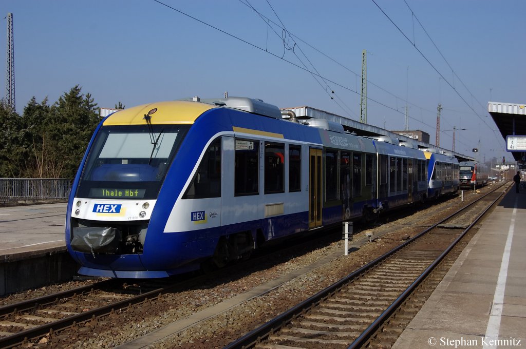 Auf Gleis 5 in Magdeburg steht das HarzElbeExpress-Dotra. Vorne die VT 800 (648 278-9) als (HEX80832) nach Thale und dahinter die VT 870 (640 121-9) als (HEX80942) nach Vienenburg. Sie fahren bis Halberstadt als Dotra und dann trennen sie sich. 01.03.2011 Stephan Kemnitz