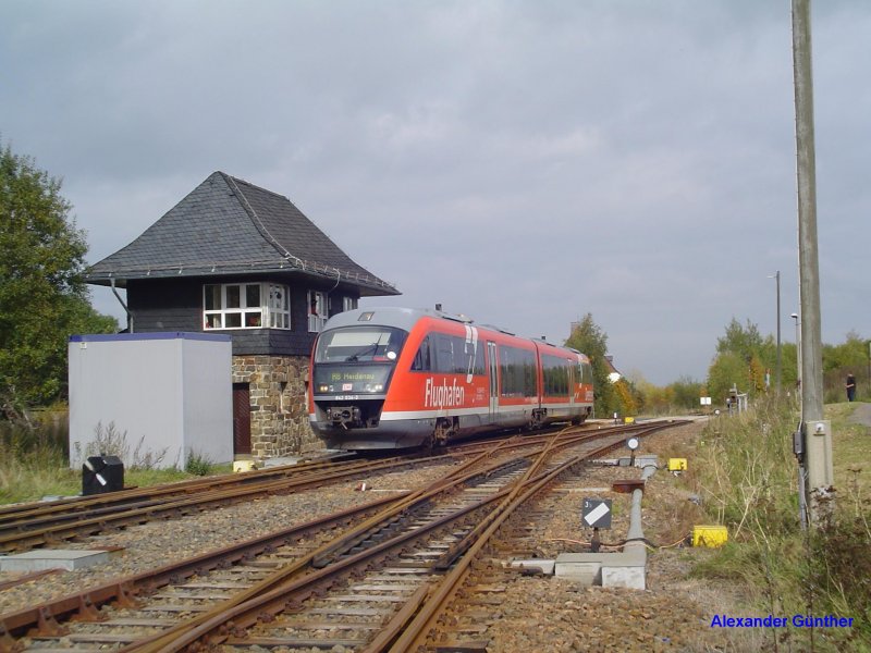 642 034-3 hat am 03.10.2007 als RB 27687 die Bergfahrt nach Altenberg (Erzgeb.) geschafft und fährt pünktlich in den Bahnhof von Altenberg ein.