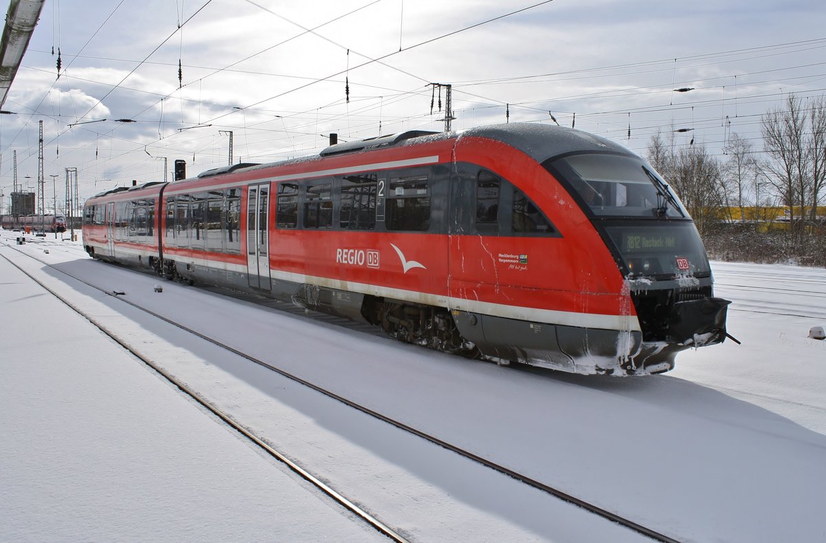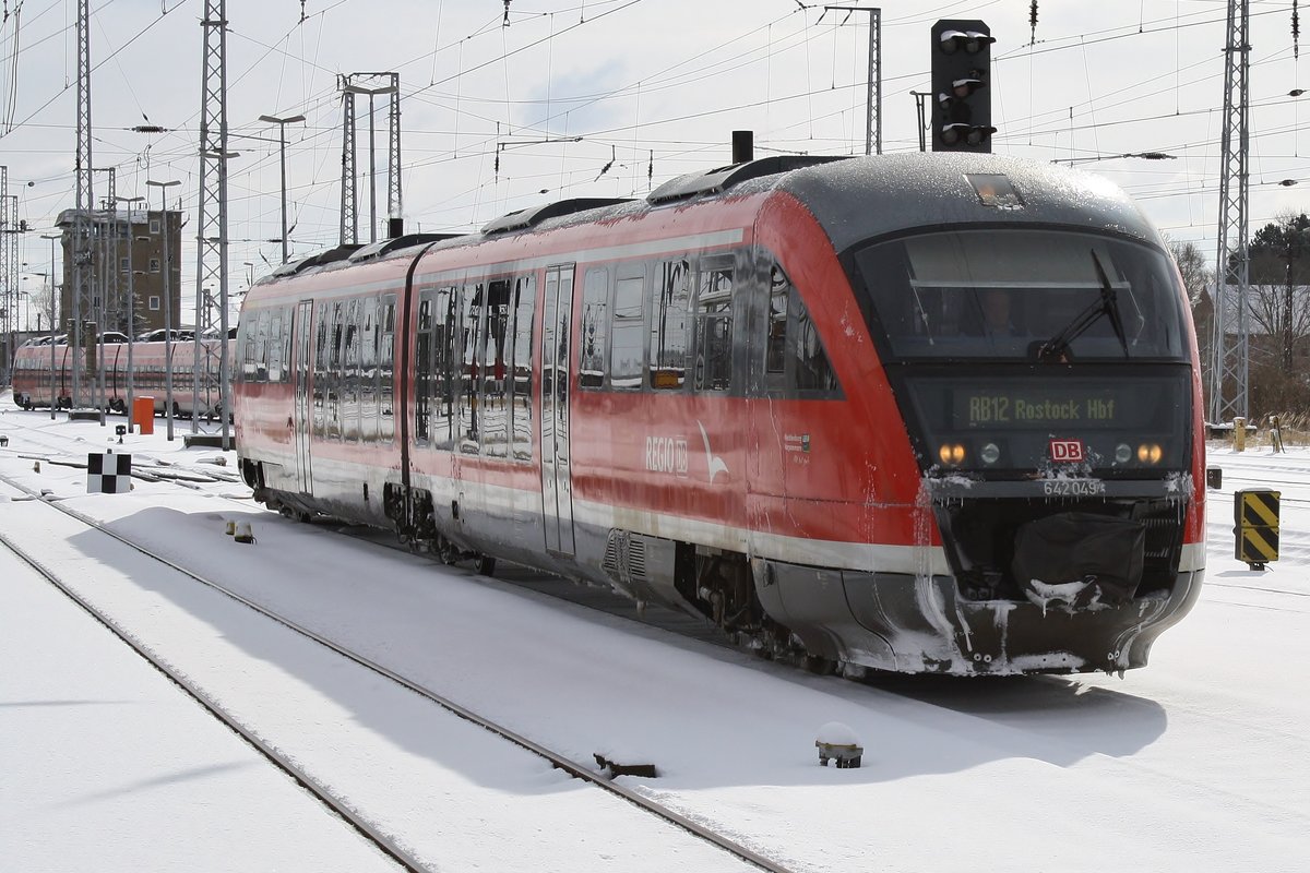 Vom Ende des Bahnsteigs an Gleis 5 eröffnet sich dieser Blick über einen Teil des Gleisvorfeldes im Rostocker Hauptbahnhof. Am 20.8.2016 wir soeben 642 049-0 als RB12 (RB13239) nach Graal-Müritz bereitgestellt. Alexander