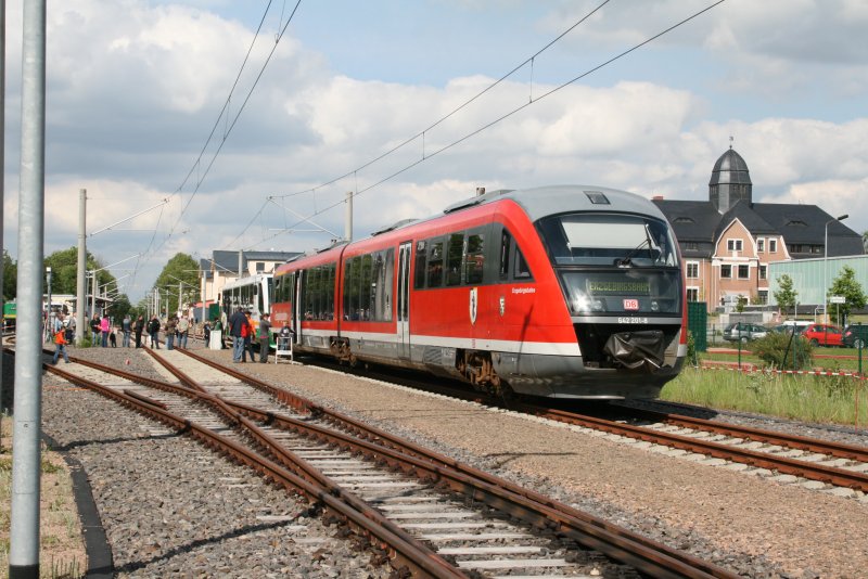 Anlässlich des 130-jährigen bestehens der Strecke St.Egidien-Stollberg(Sachs.),gab es auf dem Bahnhof Stollberg ein Eisenbahnfest.Zum "beschnuppern" war auch der 642 201-8 der Erzgebirgsbahn.16.05.09. Steffen Eule