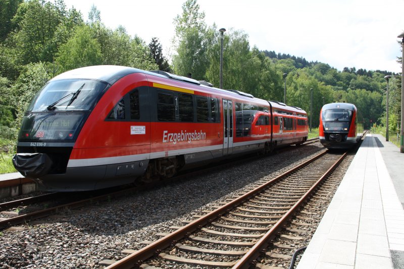 Blick vom Hetzdorfer Viadukt bei auf dem Bahnhof Hetzdorf am 08.05.09. 642 696-0 steht noch am Bahnsteig, ein weiterer Desiro macht sich gerade auf dem Weg nach Chemnitz. Daniel T.