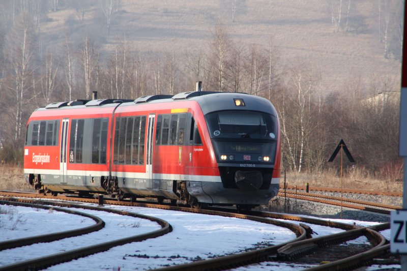 Desiro 642 700-0 der DB Erzgebirgsbahn verläst am 07.02.09 den Bahnhof Pockau-Lengefeld Richtung Marienberg.