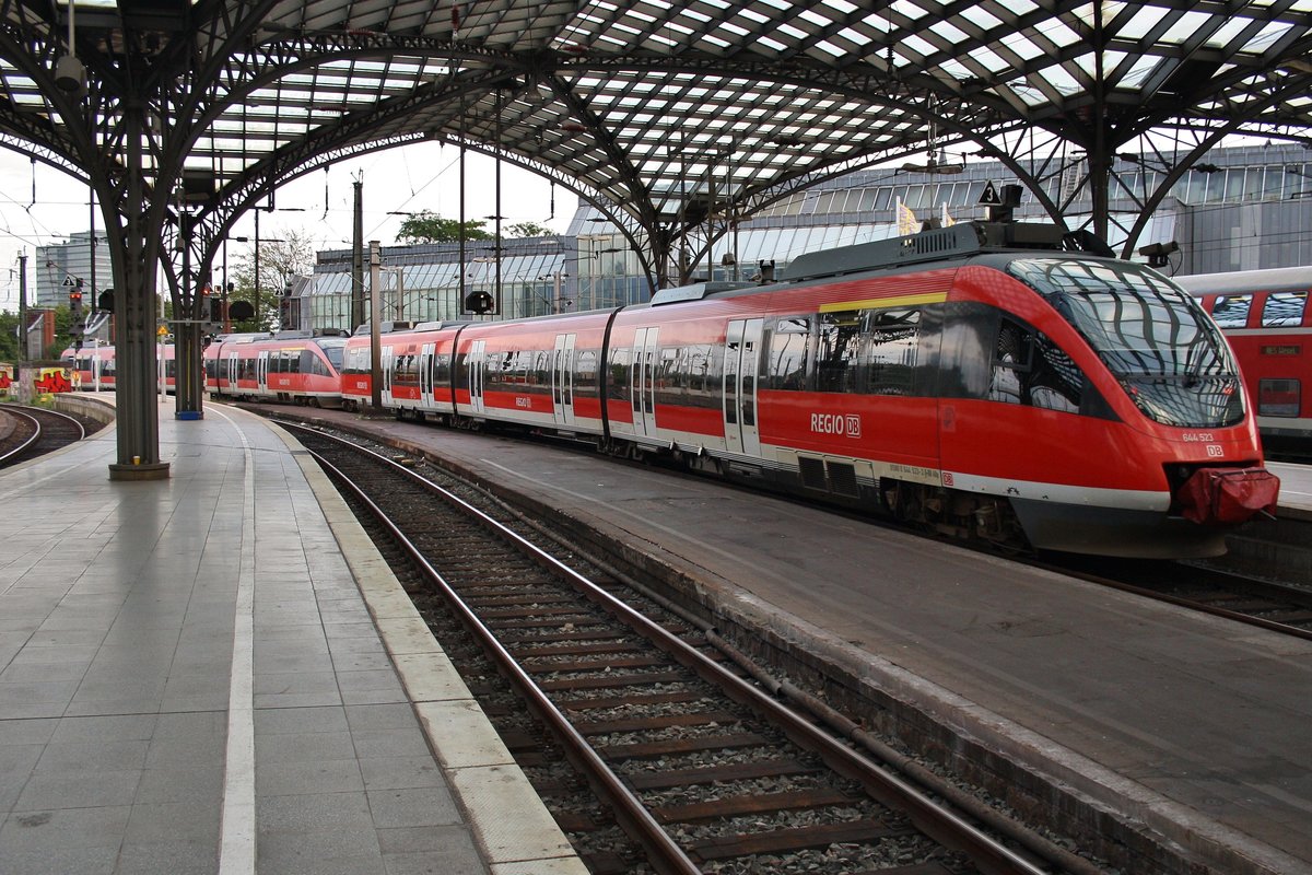 644 523-2 und 644 512-5 verlassen am 16.8.2017 als RB38 (RB11827) "Erftbahn" von Düsseldorf Hauptbahnhof nach Köln Messe/Deutz den Kölner Hauptbahnhof. Alexander