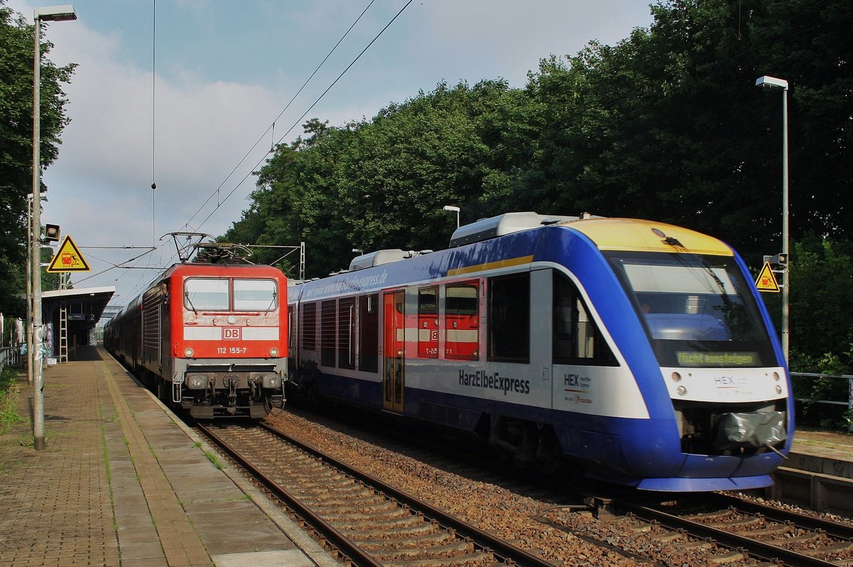112 155-7 mit RE1 (RE18171) von Brandenburg Hauptbahnhof nach Frankfurt(Oder) trifft am Morgen des 19.6.2016 in Potsdam Charlottenhof auf 648 286-2 als HEX80200 von Berlin Ostbahnhof nach Goslar und 648 283-9 als HEX80200 von Berlin Ostbahnhof nach Thale Hauptbahnhof.