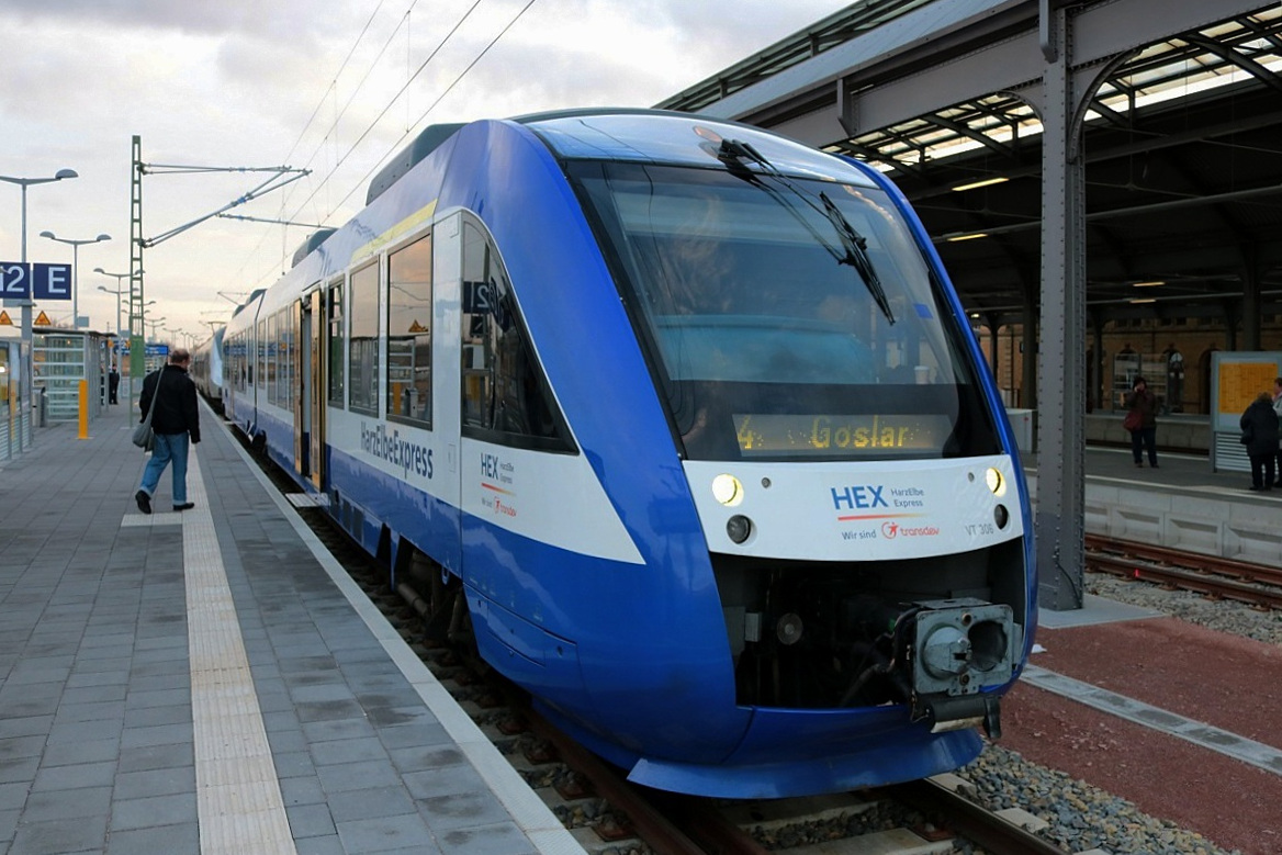 Nachschuss auf 648 362-1 (VT 306 | Alstom Coradia LINT 41) von Transdev Sachsen-Anhalt (HarzElbeExpress) und 648 366-2 (VT 302) als verspäteter HEX80408 (HEX 4) von Halle(Saale)Hbf nach Goslar, die den Bahnhof Wernigerode auf Gleis 1 verlassen. [10.3.2018 | 9:25 Uhr]