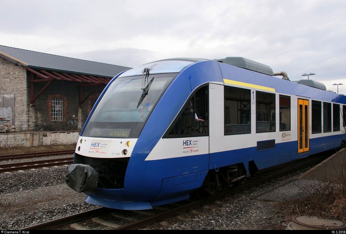 Detailansicht von 648 366-2 (VT 306 | Alstom Coradia LINT 41) von Transdev Sachsen-Anhalt (HarzElbeExpress) als verspäteter HEX80408 (HEX 4) von Halle(Saale)Hbf nach Goslar, der gemeinsam mit 648 362-1 (VT 302) den Bahnhof Wernigerode auf Gleis 1 verlässt. [10.3.2018 | 9:25 Uhr]