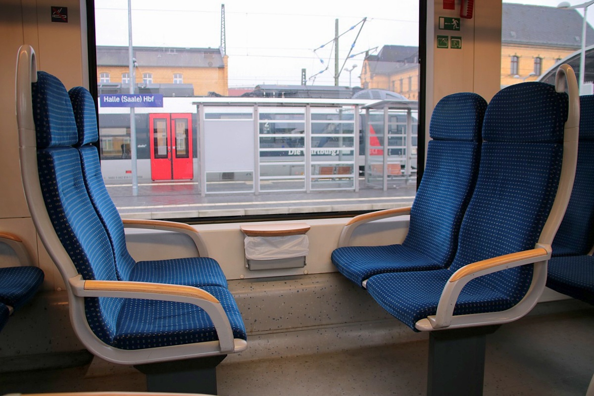 Während 648 366-2 (VT 306 | Alstom Coradia LINT 41) von Transdev Sachsen-Anhalt (HarzElbeExpress) mit Zwickauer Fußballfans überfüllt ist, bietet der neu angekuppelte 648 362-1 (VT 302) freie Platzwahl. Daher gelang es mir, dieses Innenraumfoto einer Vierer-Sitzgruppe zu erstellen. Aufgenommen im Startbahnhof Halle(Saale)Hbf auf Gleis 12 D-F als verspäteter HEX80408 (HEX 4) nach Goslar. [10.3.2018 | 7:57 Uhr]
