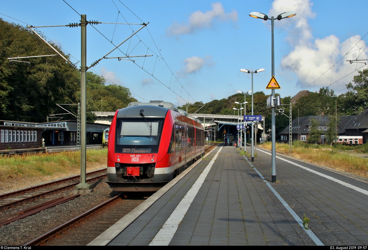 Nachschuss auf 648 463-7 (Alstom Coradia LINT 41) von DB Regio Schleswig-Holstein (DB Regio Nord) als RE 21906 (RE72) von Eckernförde, der seinen Endbahnhof Flensburg auf Gleis 4 erreicht.