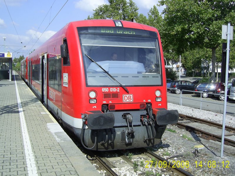 650 010-2 und 650 018-5 sind gerade aus Herrenberg in Metzingen eingetroffen und fahren gleich weiter nach Urach. Das Bild entstand am 27.9.2008.