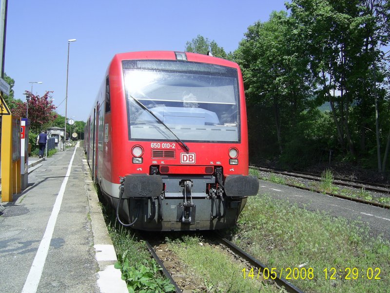 650 010-2 fährt am 14.5.2008 bei strahlendem Sonnenschein in den Bahnhof Oberlenningen ein.