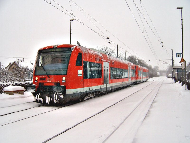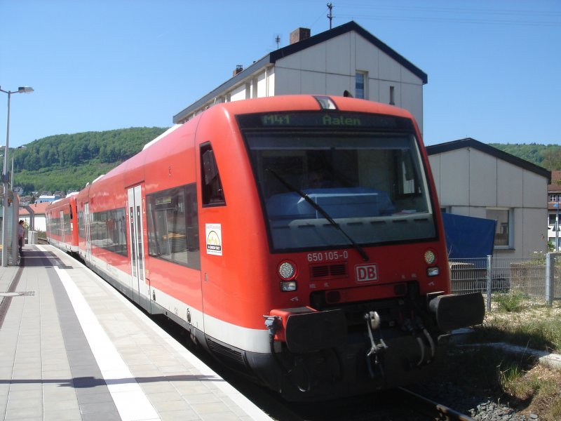 Hier sieht man den VT 650 105-0 beim kurzen Aufenthalt in Hofen(b Aalen). Wegen mehr als 5 min Verspätung hielt der Lokführer am Bahnhof höchsten 15 sek und fuhr dann mit vollgas los... P.F.