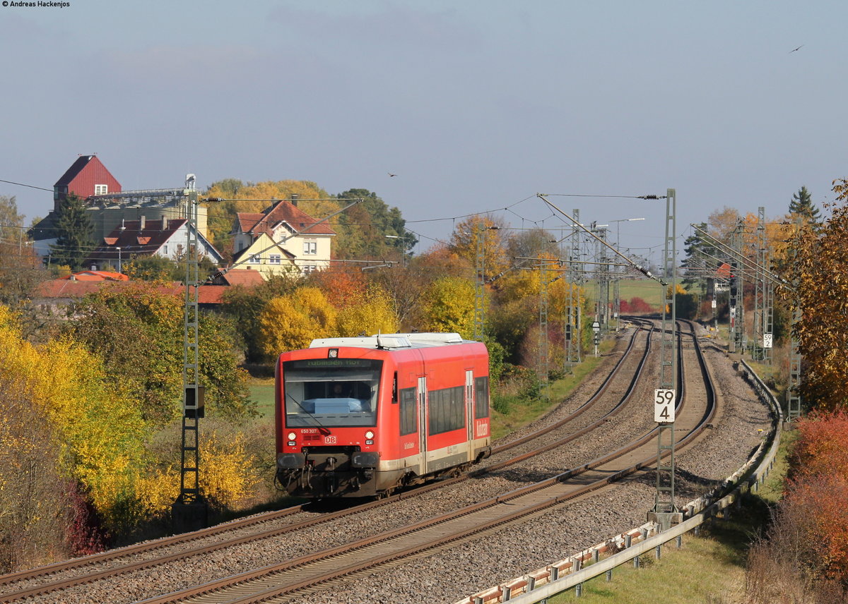 650 307-2 steht als RB 22279 Pforzheim Hbf - Horb (Neckar) abfahrbereit auf Gleis 1 des Pforzheimer Hauptbahnhofs. Im Hintergrund der Kirchturm der Franziskuskirche. 26.01.07 Georg Vogt
