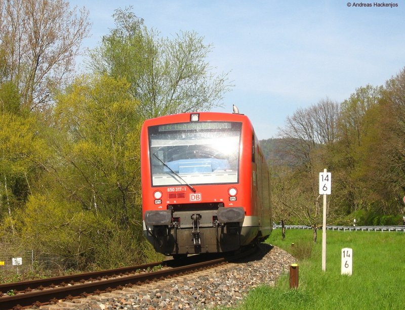 650 317-1 und 320-5 als RB 22759 nach Friedrichshafen-Hafen am km 14,6 der KBS 731 (Bodenseegürtelbahn) 27.4.08