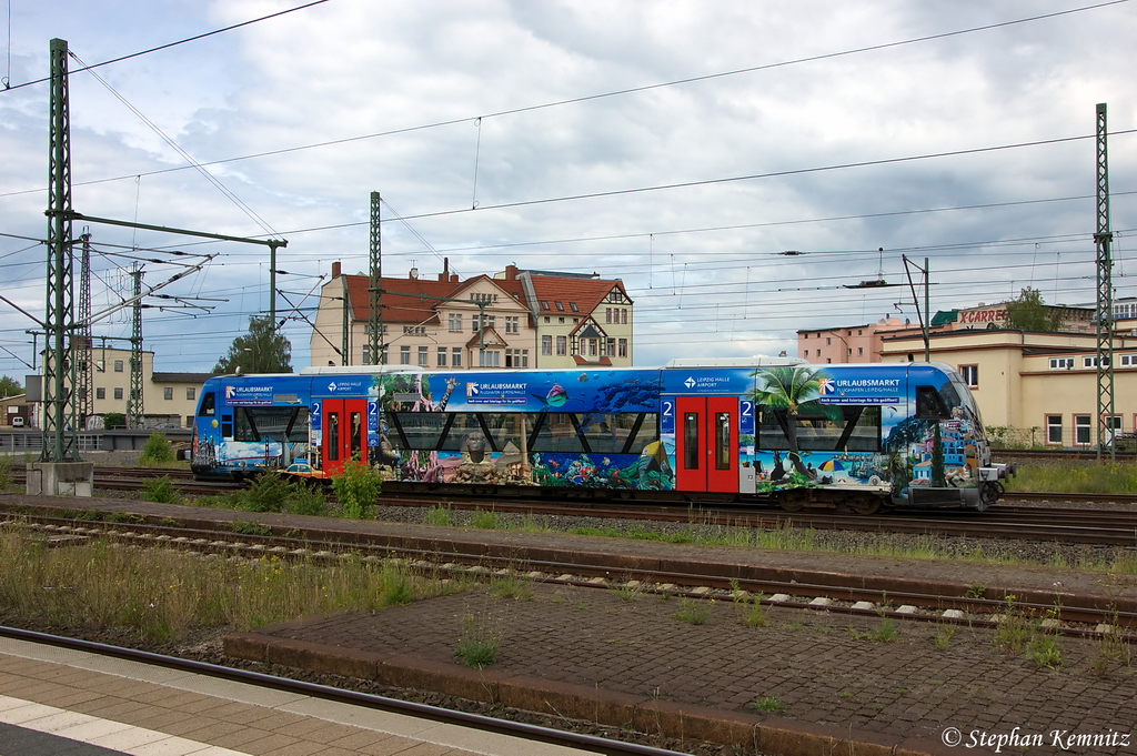 VT 011  Urlaubsmarkt Flughafen Leipzig/Halle  (650 543-1) MRB - Mitteldeutsche Regiobahn als HEX RB47 (HEX80979) von Bernburg nach Halle(Saale)Hbf, bei der Einfahrt in den Haller Hbf. 12.06.2012
