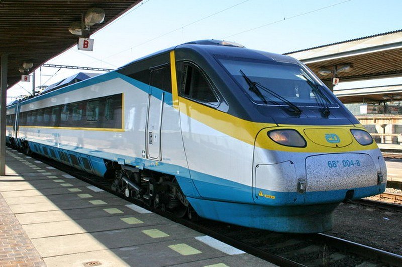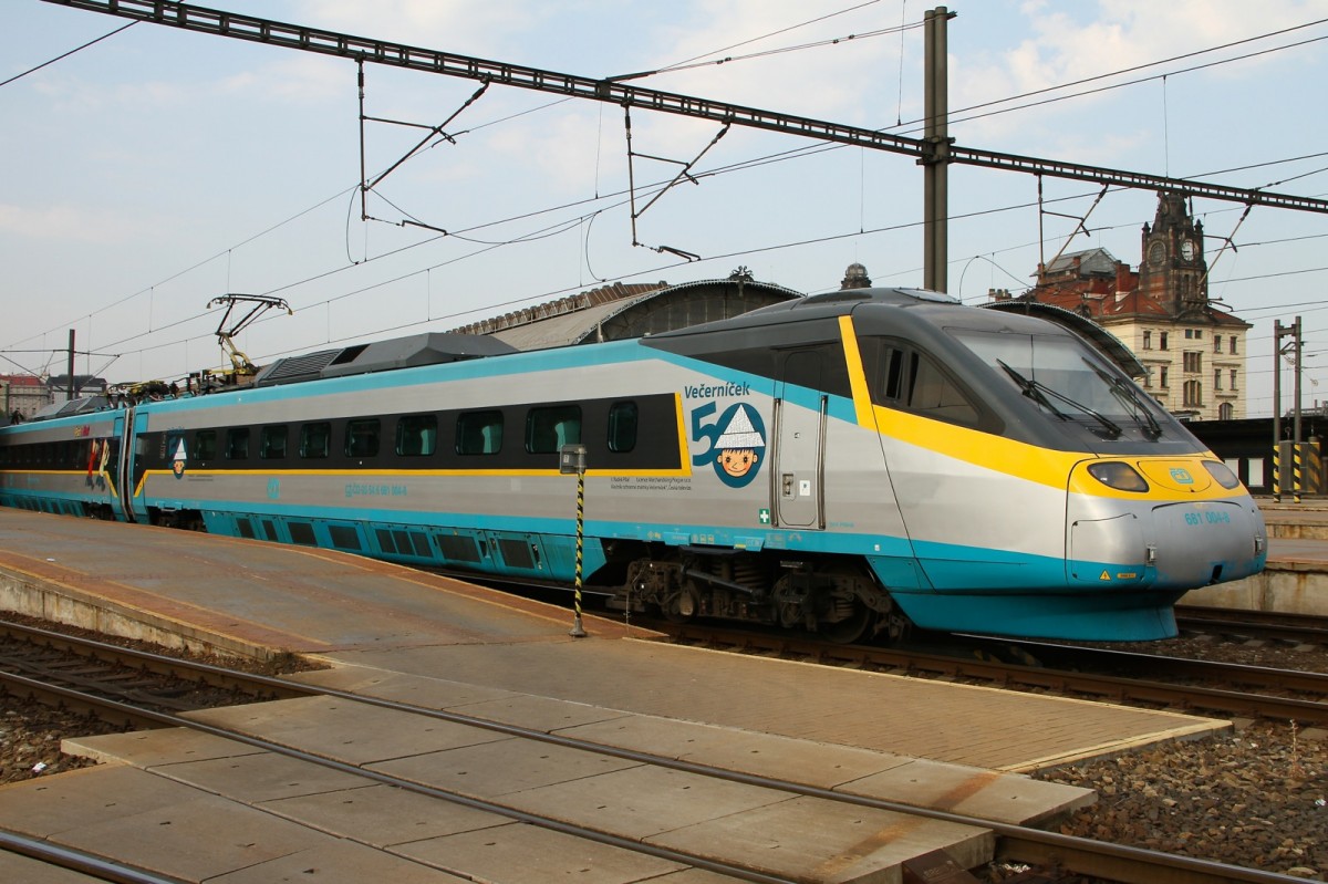 681 004-8 Pendolino am 12.08.2015 im Prager Hauptbahnhof. Der ganze Zug ist tschechischen Komik Helden verziert. Bild am 12.08.2015 von einem Hügel beim Národní památník na Vítkově Park geknipst.