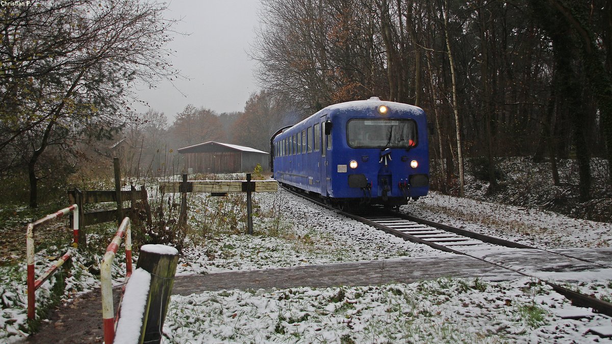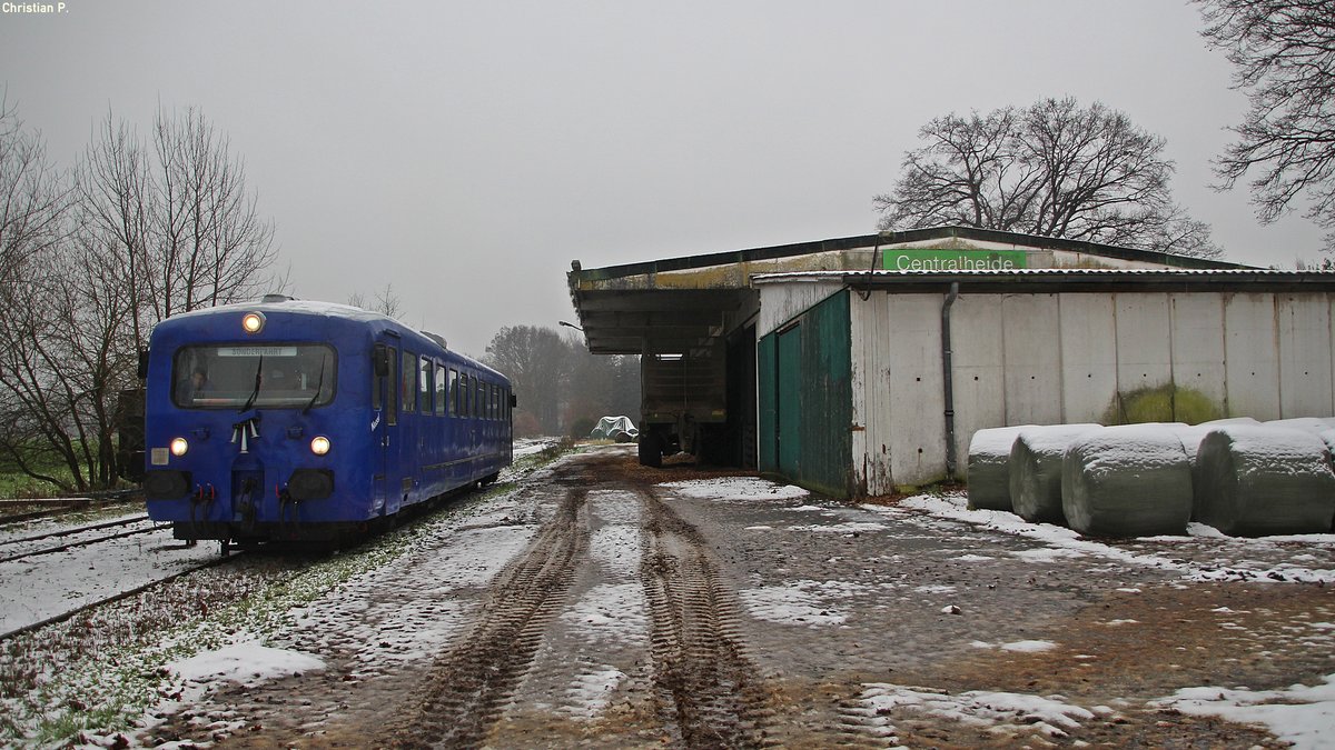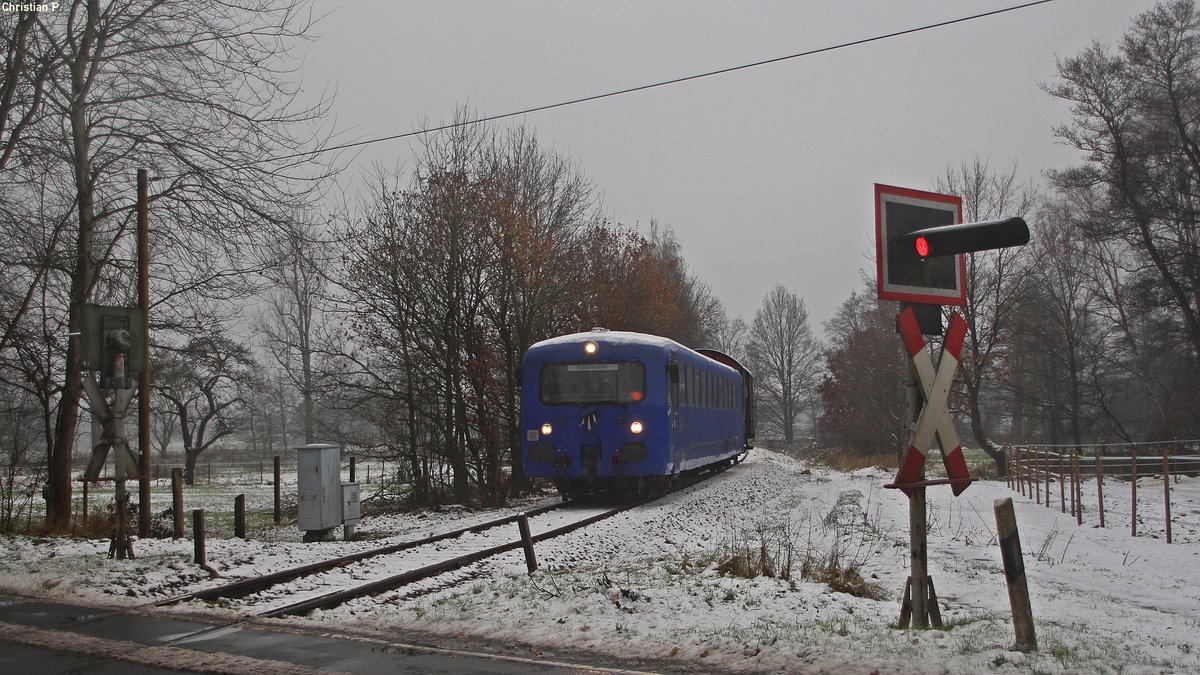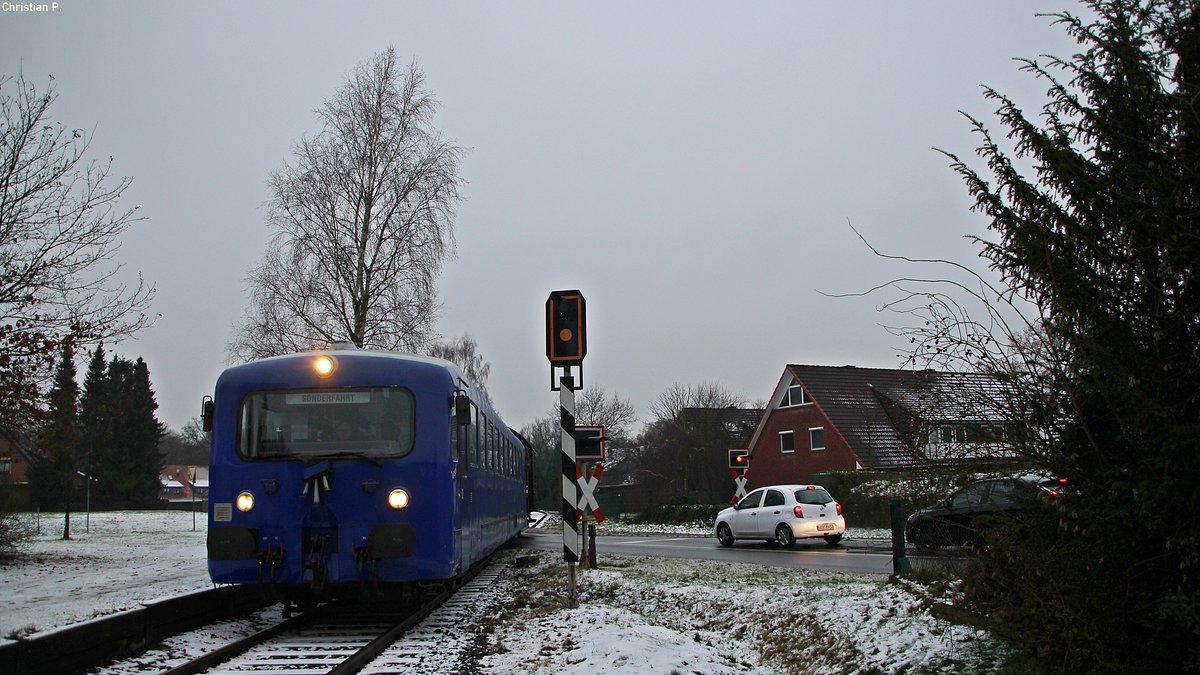 Am 3.12.17 fuhr der ehem. ETA 515 523-9, jetzt 686 002-6 "Nessel" (95 80 0686 002-6 D-NEG) der Schienenflotte GmbH im Auftrag der Verdener Eisenbahnfreunde - Kleinbahn Verden - Walsrode e.V die angekündigten sonderfahrten zum Nikolaus (3.12.17 & 10.12.17) von Verden nach Stemmen und umgekehrt. Am Ortsende von Verden-Eitze passiert der VT auf Sonderfahrt als Zug 20 die Blinklichtanlage vor dem Hp. Verden-Eitze.
