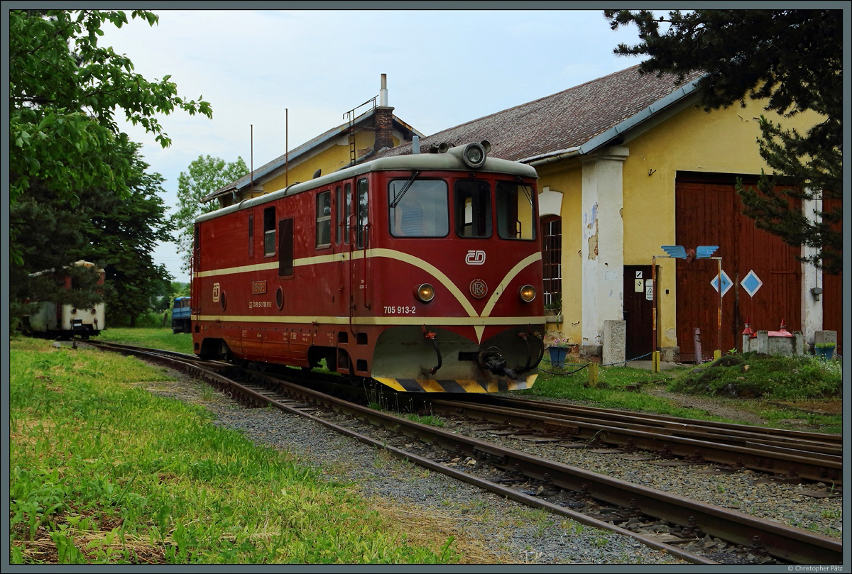 705 913-2 am 04.06.2017 vor dem Lokschuppen in Osoblaha (Hotzenplotz). Schön anzusehen ist die liebevoll gestaltete Miniaturburg vor den Schuppentoren.