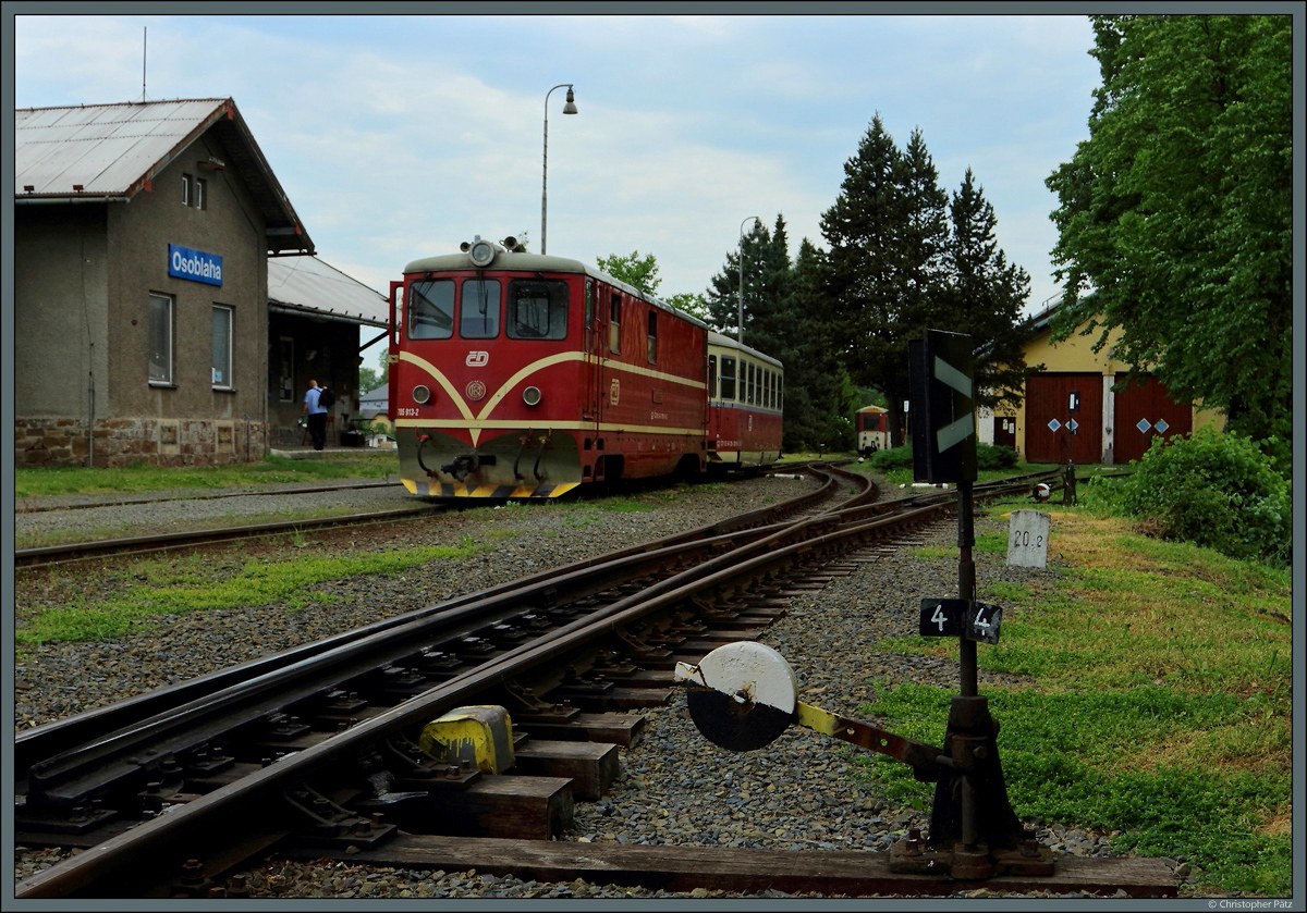 Im Bahnhof Osoblaha (Hotzenplotz) steht 705 913-2 mit dem Zug 20610 nach Třemešná ve Slezsku (Röwersdorf) bereit. (04.06.2017)