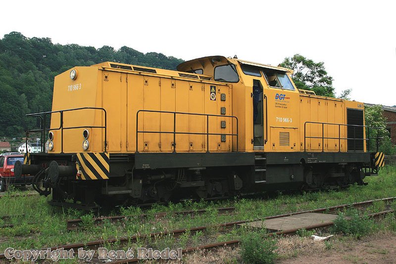 Die Bahnanlage in Bad Schandau wird in der nächsten Zeit umgebaut. Daher sind zur Zeit einige Vorbereitungen im Gange. Auch einige Loks wie die 710 966-3 von DGT war mal da anzutreffen. Sie brachten einige Maschinen für die Gleißanlagen die erneuert werden. Aufnahme von 22.5.2007. René Riedel