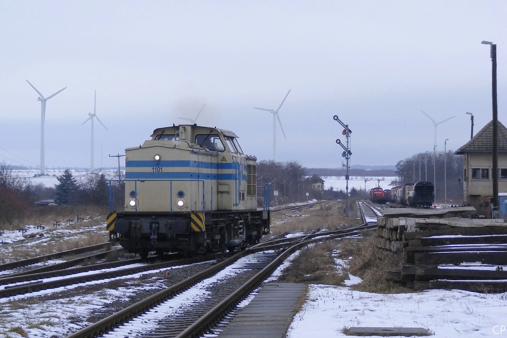 1101 der ITB (ex 710 968-5 der DB) verlässt den Bahnhof Klostermansfeld Richtung Hettstedt am 20.2.2009. Rechts ist das "Arbeitsmaterial" der Malowa zu sehen. Christopher Pätz