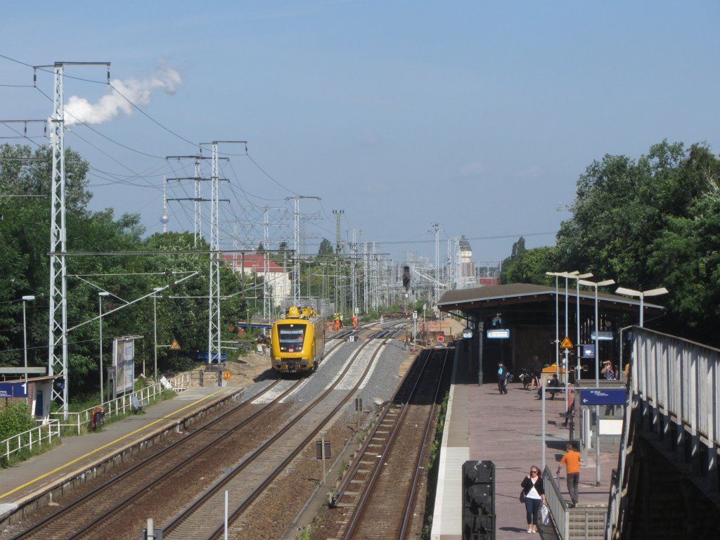 Der Regionalbahnsteig Richtung stadtauswärts in Karlshorst wurde wegen Bauarbeiten etwas von den Hilfsbrücken weg verschoben. Baufahrzeug 711 122-2 überquert von den Neuerungen unbeirrt die Hilfsbrücken. 15.6.2012