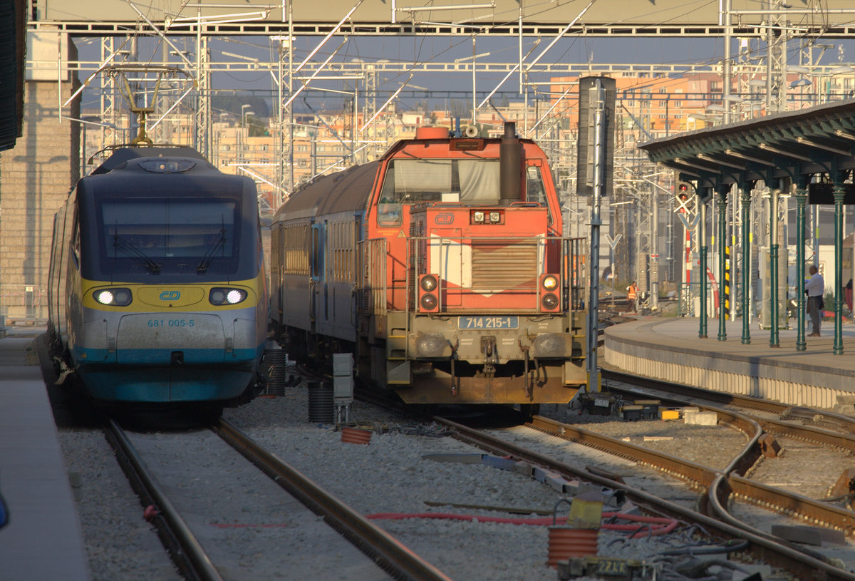 681 005-5 läuft in Pilsen ein und wird den den Fotografen nach Cheb bringen. Rechts im Bild 714 215-1 23.09.2016 17:58 Uhr.