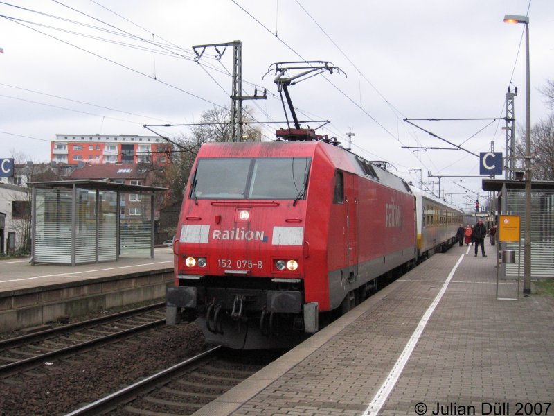 152 075-8  mit Schienenprüfzug 1 719 101-8  am 4.2.2007 auf der Fahrt Richtung Süden iN Elmshorn.