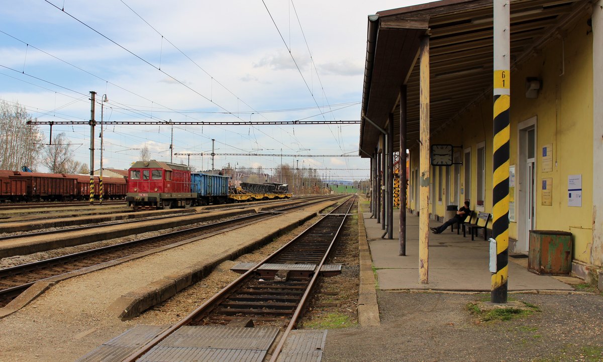 Am 12.04.18 fuhr 720 108-0 (T 435 0108) mit einem Bauzug durch Tršnice über die Verbindung nach Františkovy Lázně. Nun ist die Lok am anderen Ende des Zuges und diese steht zur Abfahrt in Františkovy Lázně nach Cheb bereit.