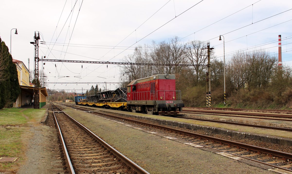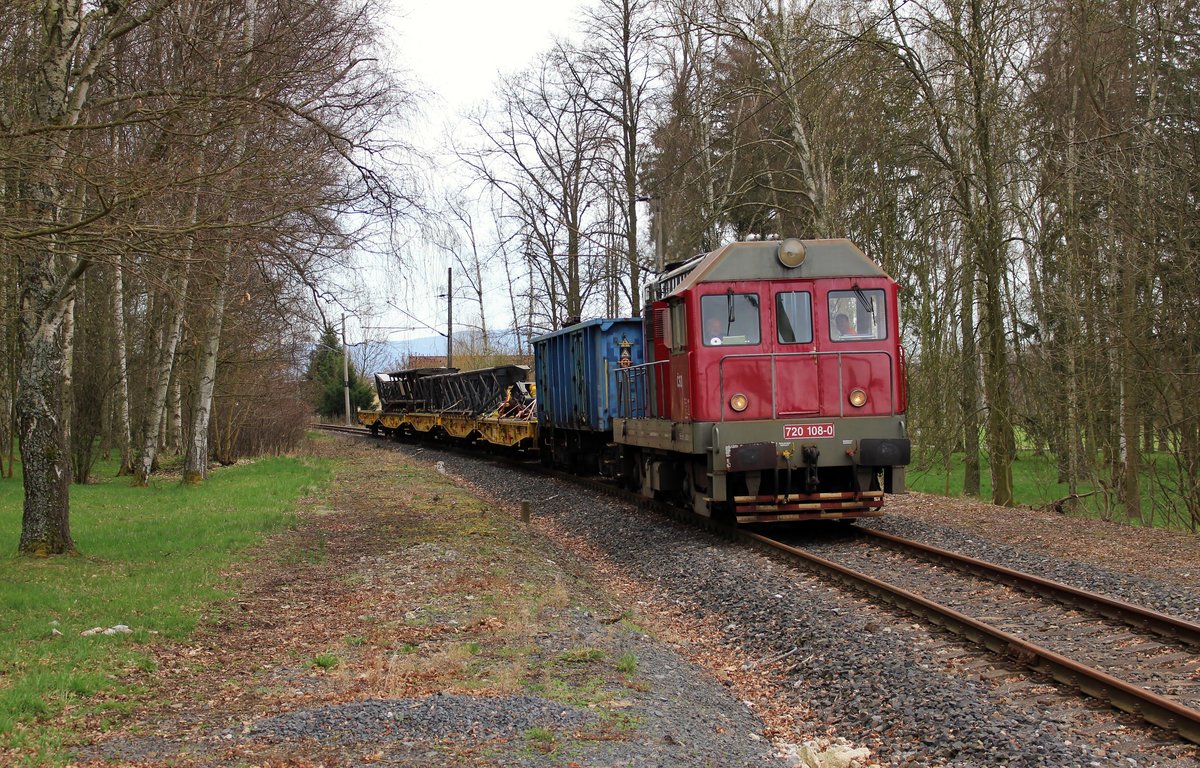 Am 12.04.18 fuhr 720 108-0 (T 435 0108) mit einem Bauzug durch Tršnice über die Verbindung nach Františkovy Lázně.