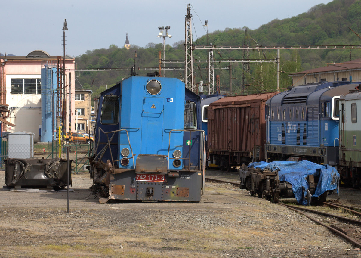Ausgegleist, sicher zur Verschrottung vorgesehen, ist hier 742 173-8. Das ehemals sehr weitläufige Gelände des BW Ustin nad Labem ist heute deutlich geschrumpft und geht in wüstes Gelände über. Somit ergeben sie viele Fotomöglichkeiten, allerdings ist ein Tele von Vorteil um das Betriebsgelände nicht betreten zu müssen. 26.04.2019 15:35 Uhr. Siegfried Heße