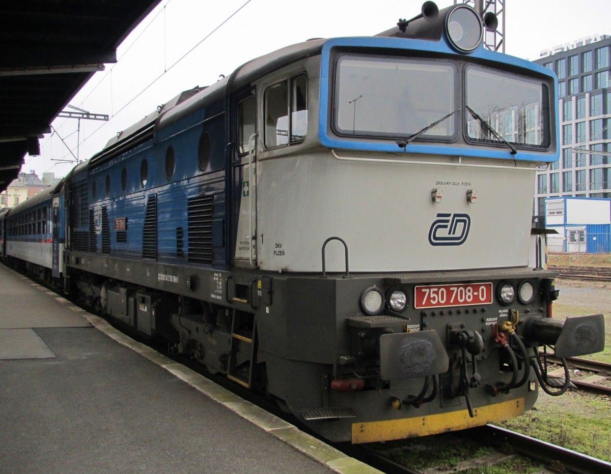 18.2.2015 12:18 ČD 750 708-0 mit einem Schnellzug (R) nach Rakovník im Startbahnhof Praha Masarykovo nádraží.