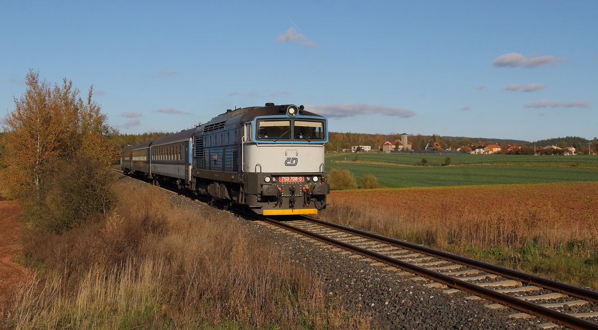 CD 750 708-0 mit einem Schnellzug aus Prag nach Rakovnik auf dem Bahnstation Kačice am 8.10.2013.