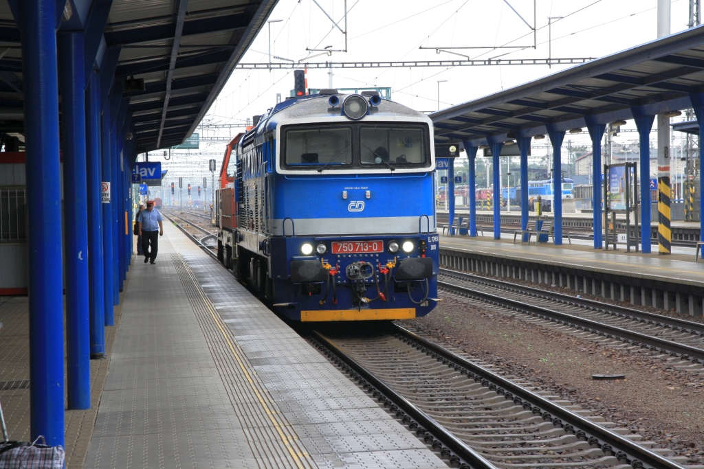 Der von der CD 750 713-0 gezogene R 664 "Jakub Krcin" (Brno hl.n. – Plzen hl.n.) fährt am 15.August 2018 durch den Bahnhof Zastavka u Brna. Karl Seltenhammer
