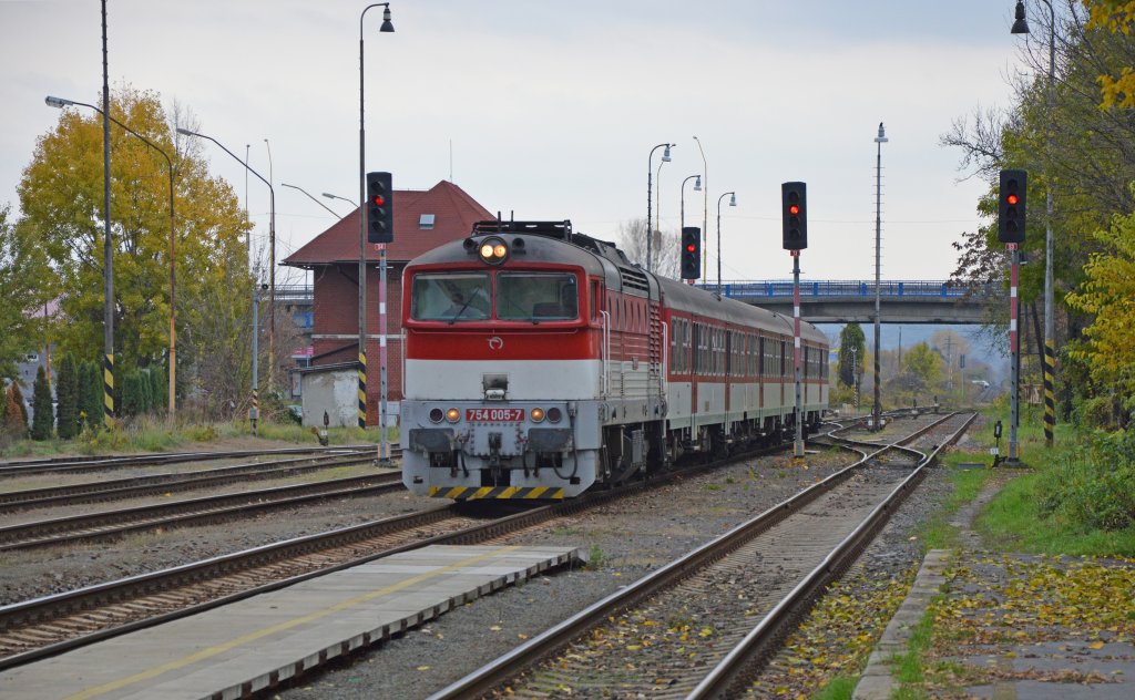754 005-7 mit Regionalzug Os 6212 Fiľakovo (13:20) – Zvolen os. st./Altsohl Persbf. (14:53) fährt in Knotenbahnhof Lučenec/Lizenz ein; 03.11.2012 Tomas Kowalski