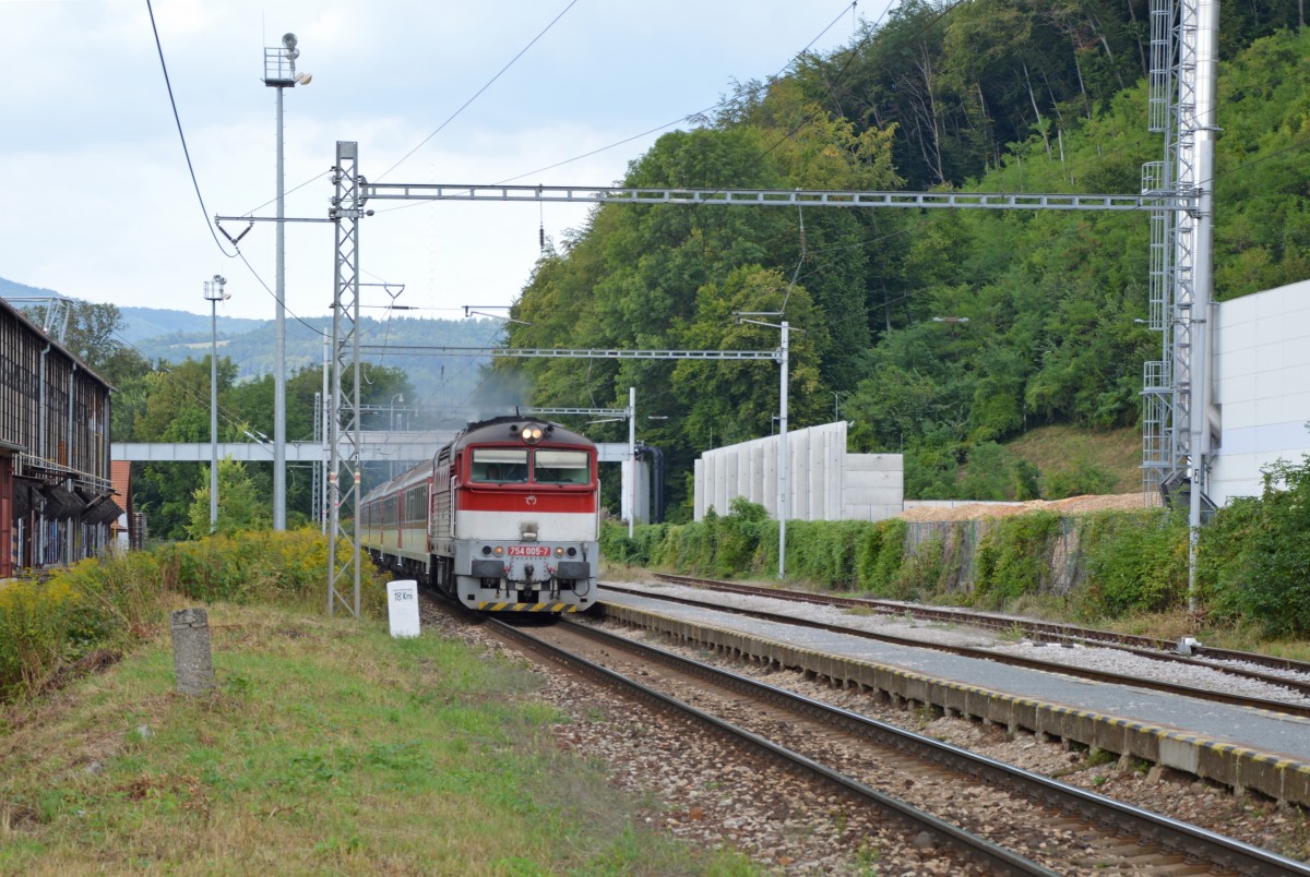 754 005-7 mit Eilzug Zr 1849 „Bori¨ov“ ´ilina/Sillein – Zvolen os. st./Altsohl Persbf. (Kurswagen ´ilina – Zvolen – Bratislava) lauft durch den Bahnhof Radvaň (Stadtteil von Banská Bystrica); 30.08.2013 Tomas Kowalski