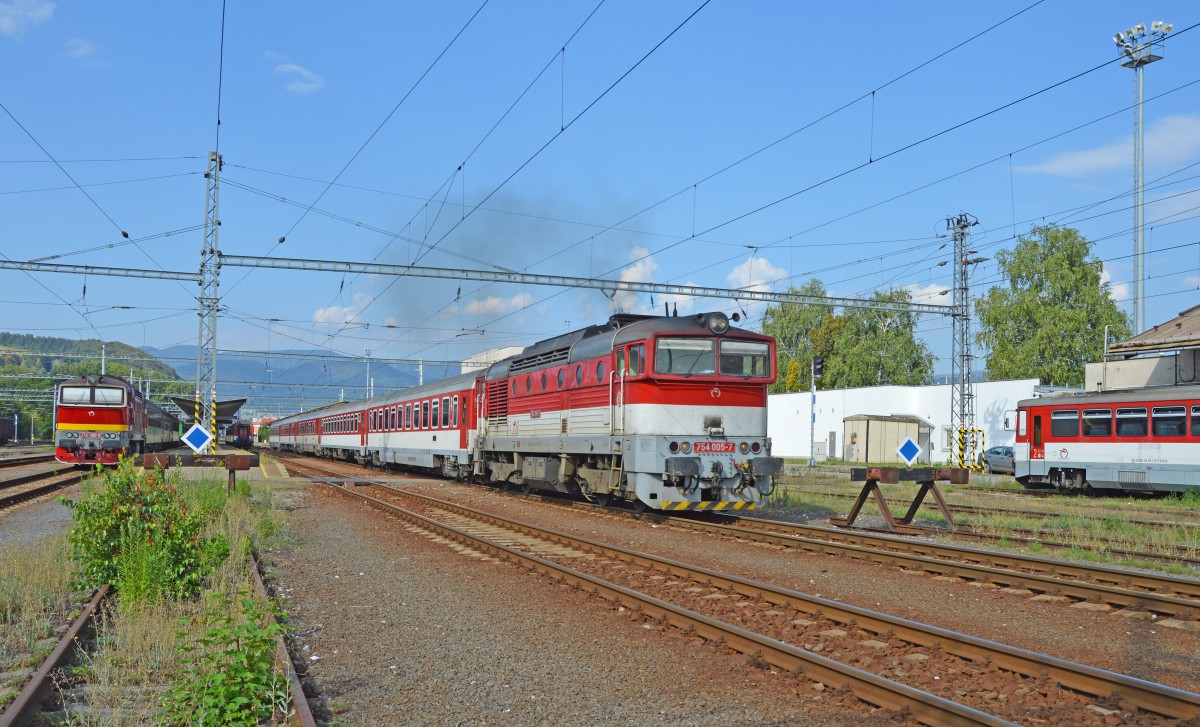 754 005-7 mit Expresszug Ex 220 „Detvan“ („Der Jüngling aus Detva“) Zvolen/Altsohl – Prag fährt in den Hauptbahnhof von Banská Bystrica ab; 30.08.2013 Tomas Kowalski