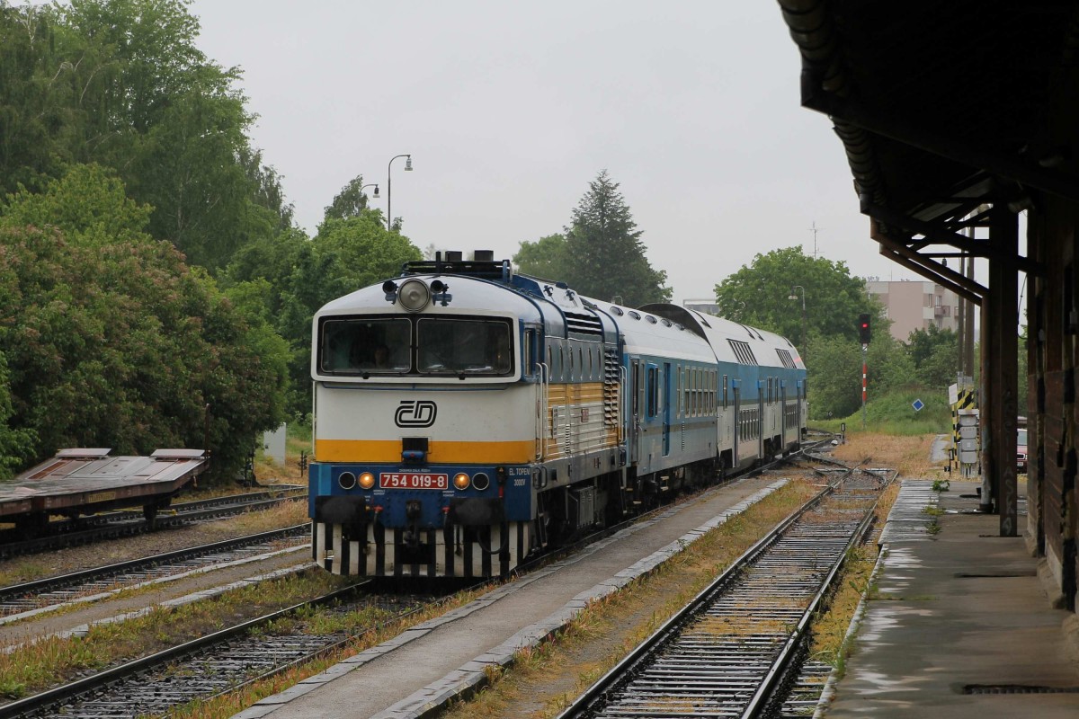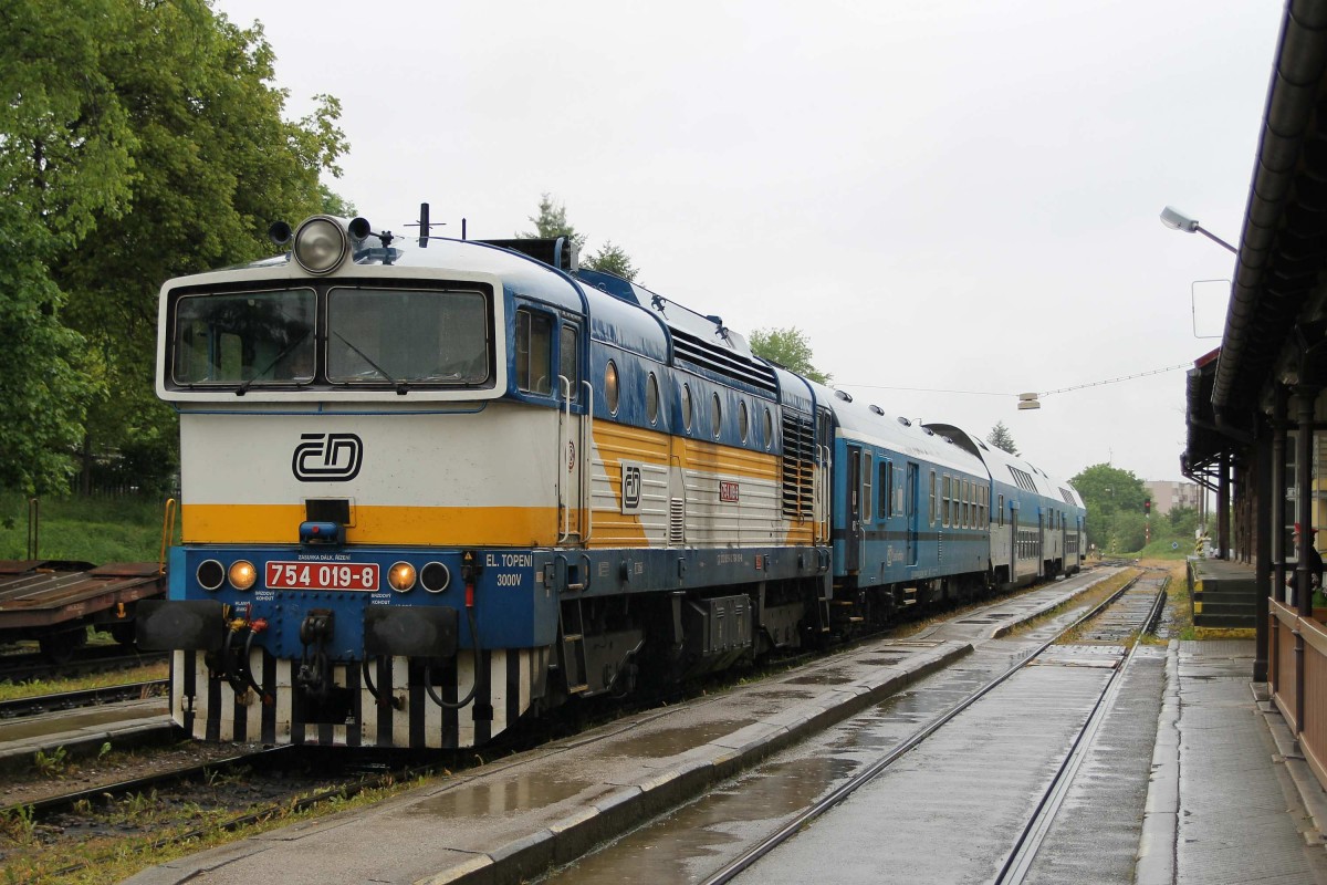 Während trübes Wetter steht die 754 019-6 mit Os 8109 České Budějovice-Nové Údolí abfahrtsbereit auf Bahnhof Český Krumlov am 3-6-2013.
