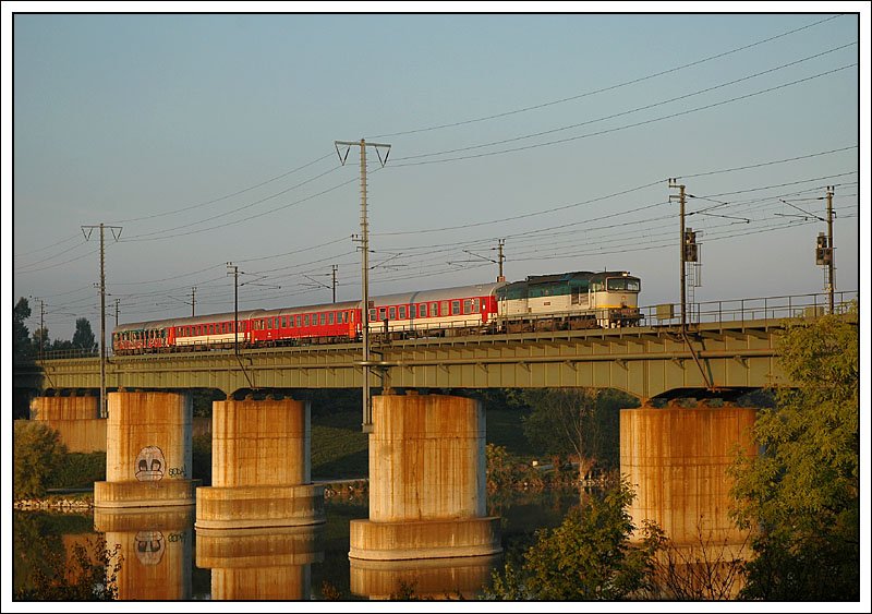 EuRegio ER 2510  Roland  von Wien nach Bratislava hl.st. am Morgen des 30.9.2007 bei der Querung der Neuen Donau in der Wiener Lobau. Bespannt war der Zug mit 754 035-4. Lt. meinen Informationen hat diese Lok dann am Nachmittag im Bereich Glinzendorf mit dem  ER 2527  ihr gesamtes Motoröl verloren. Aufgrund des Öldruckmangels wurde die Maschine dann in der Hst. Erzehrzog Karl Straße untauglich