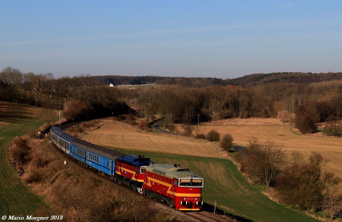 754 049 (CZ-CD 92 54 2 754 049-5) + 750 308 (92 54 2 750 308-9 CZ-) mit Sonderzug Sv11964 bei Tanvald am 07.04.2018