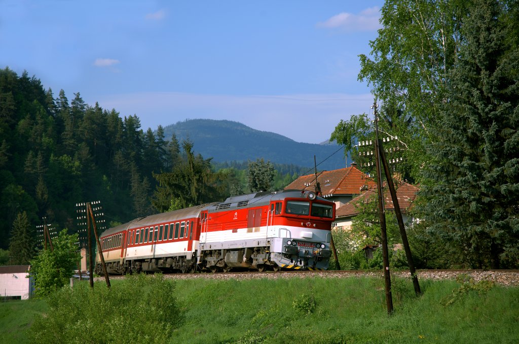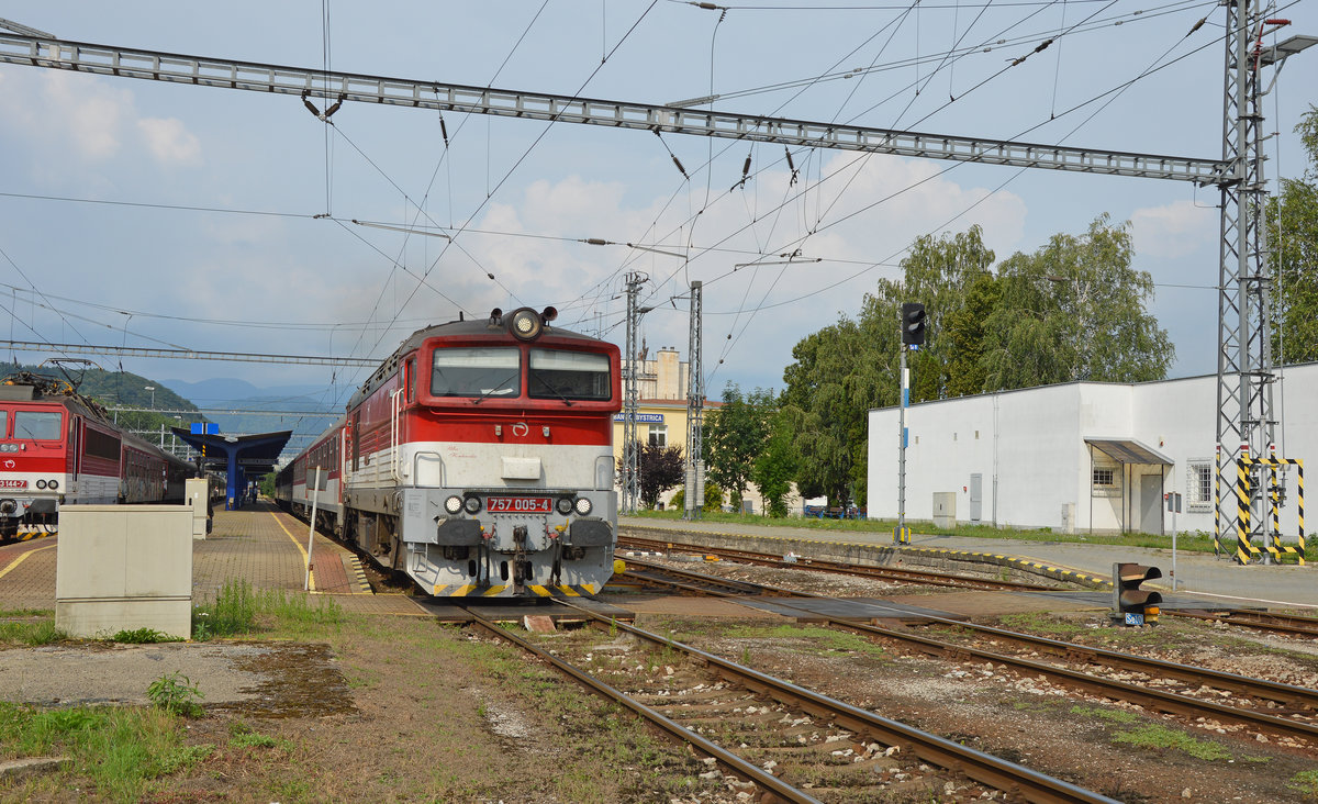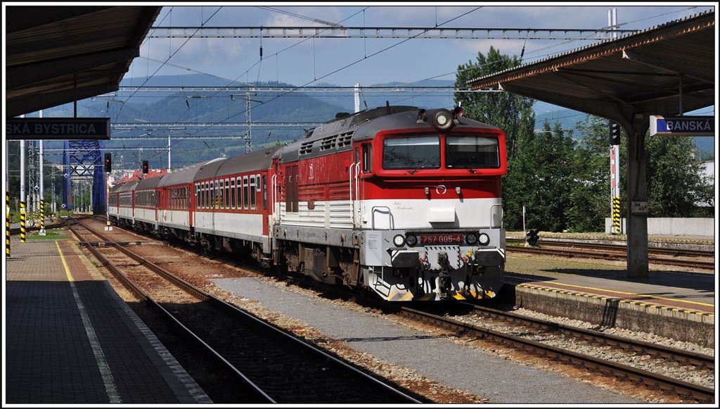 757 005-4 mit RegionalExpress REX 1842 „Šturec“ Banská Bystrica/Neusohl (09:34) – Turčianske Teplice – Vrútky – Žilina/Sillein (11:06) fährt ab Startbahnhhof. Links Garnitur des Fernzuges R 831 „Tajov“ Bratislava hl. st. – Zvolen os. st – Banská Bystrica. (Abgebildet von Platz zwischen Gleise im Breite des Bahnsteiges); 24.07.2016 Tomas Kowalski