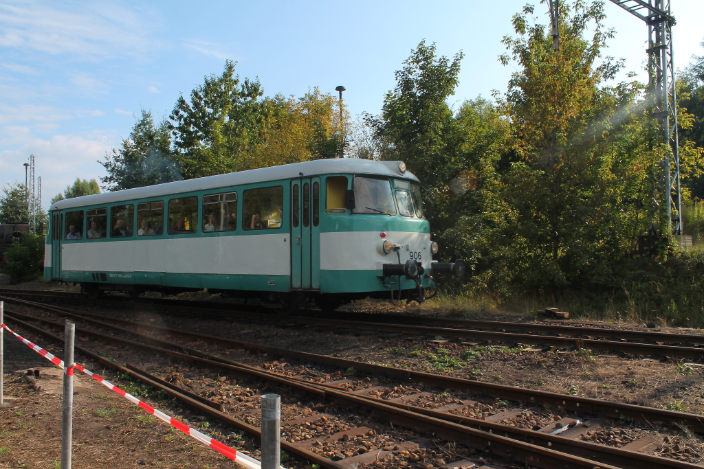 Der Schienenbus der HVLE 771 906-4 verläßt am Abend des 08.09.2012 das 9. Berliner Eisenbahnfest im Bw Berlin Schöneweide.