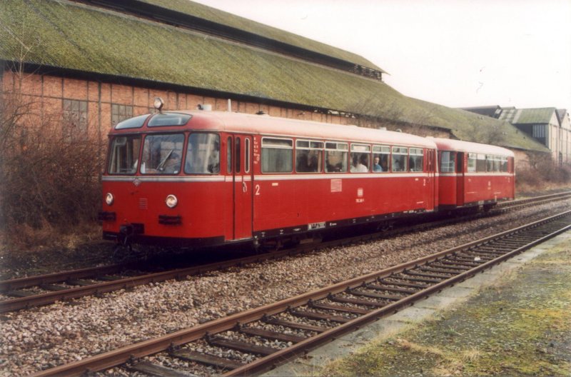 Schienenbus 795 240-1 mit Anhänger 995 019-7 auf einer Sonderfahrt nach Überherrn (Saar) im Frühjahr 1996.