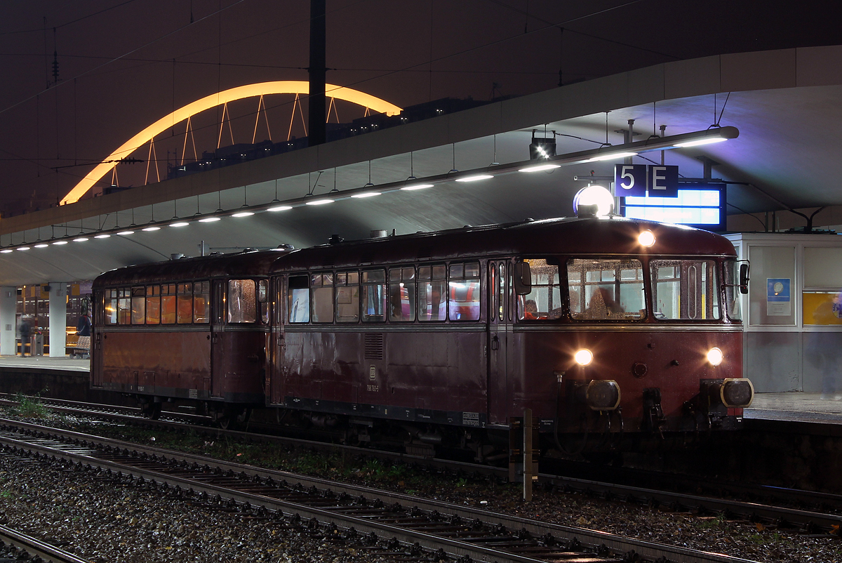 Lahntalbahn Herbst am 06.11.2015, hier eine fünfteilige Schienenbus-Garnitur mit dem 798 760-5 der Kasbachtalbahn abends bei Burgsolms. Der Schienenbus befand sich auf einer mehrtägigen Sonderfahrt durch Deutschland von "Zugtouren.de". Leider ist er mit knapp 45-minütiger Verspätung gefahren, so dass es fast schon Nacht war. Das war auf den allerletzten Drücker!