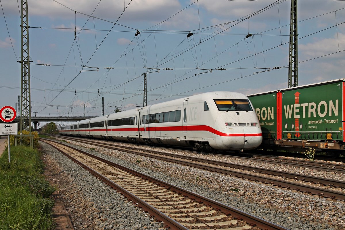 Nachschuss auf 808 001-2 "Rheinsberg" am 04.05.2016, als dieser als Ersatz für einen ausgefallenen ICE 1 (401er) von der Schweizer Grenze nach Norddeutschland fuhr, und hier durch dei Bahnhofsanlagen von Müllheim (Baden) gen Freiburg kam. Tobias Schmidt
