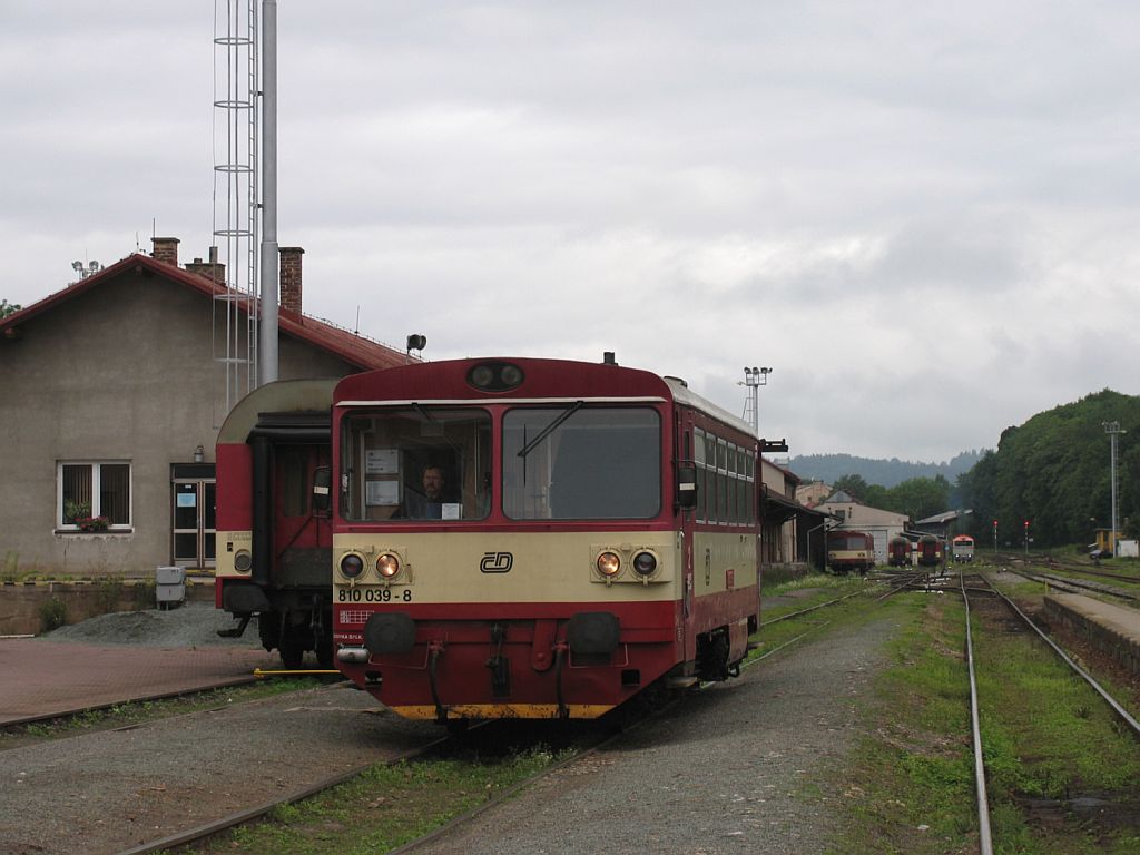 810 039-8 steht am 13.07.2007 zur Rückfahrt nach Most im ehem. Grenzbahnhof Moldava v Krus.horac zur Abfahrt bereit. Heute endet hier die aus dem böhmischen Becken kommende Strecke. Früher führten die Gleise weiter in Richtung Holzhau bzw weiter nach Freiberg. Es ist bereits geplant, die Strecke von Holzhau (bis dorthin fahren die Züge der FEG von Freiberg aus) bis nach Moldava v Krus.horac wieder zu reaktivieren.