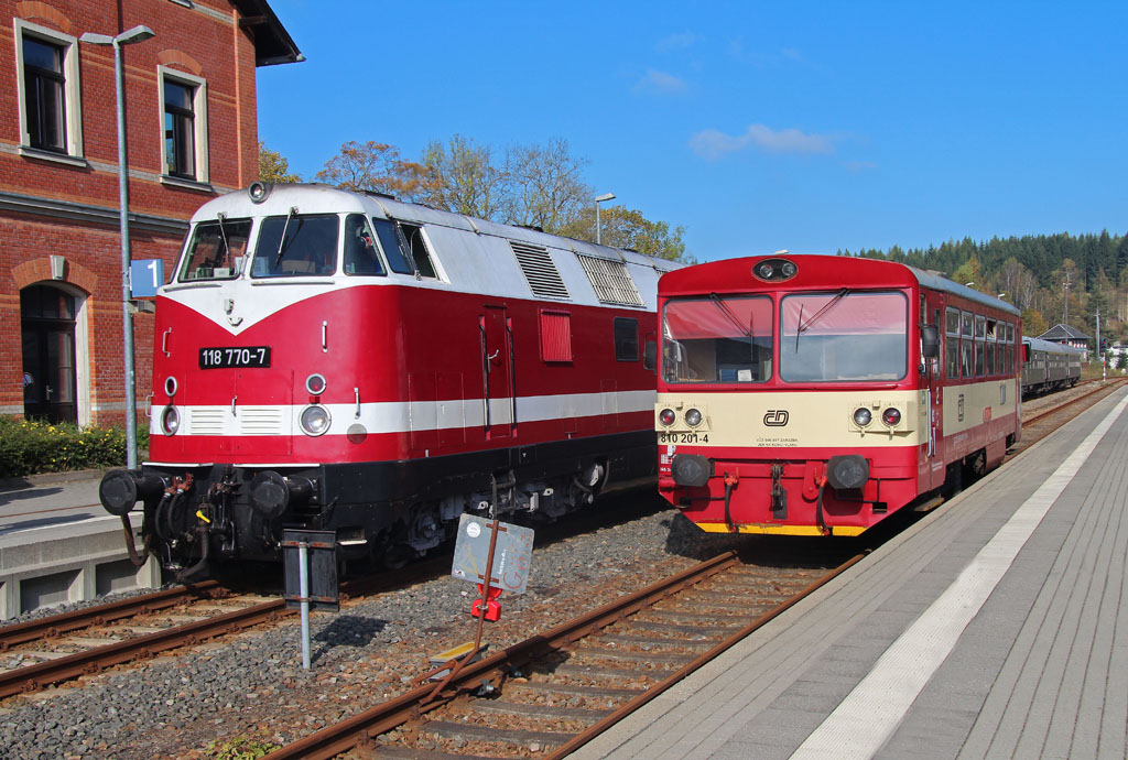 Am 04.Oktober 2014 war 118 770-7 mit einem Sonderzug von Marienberg aus zu einer Fahrt durch das Erzgebirge unterwegs. Im Bahnhof Johanngeorgenstadt kam es zu einer Begegnung mit einem tschechischen Triebwagen der BR 810 (810 201-4). René Richter