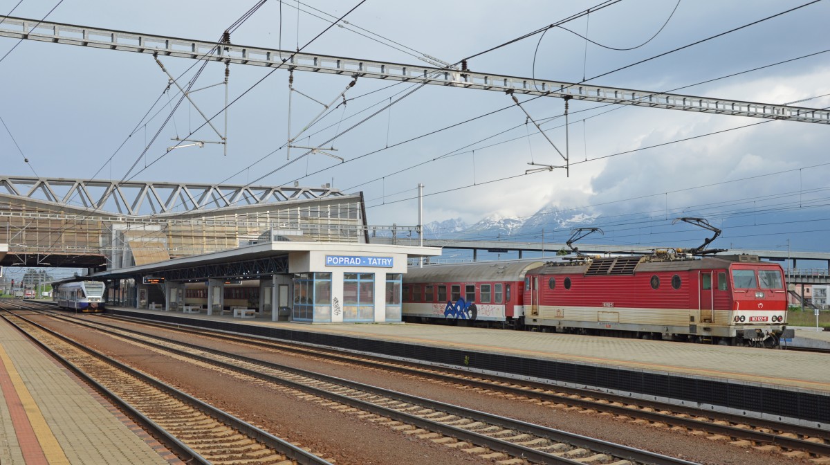 Ostblick auf Hauptbahnhof von Poprad/Deutschendorf mit der Hohen Tatra im Hintergrund; links Tw 840 005-7 vor Abfahrt als Os 8307 Poprad-Tatry (07:46) – Kežmarok/Käsmark (08:12); rechts 163 122-5 wird fährt mit Regionalzug Os 7811 Poprad-Tatry – Košice/Kaschau (Abf. 08:42); 10.05.2014 Tomas Kowalski