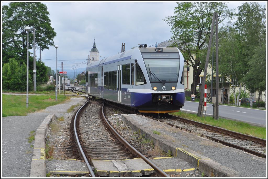 Schmal- und Normalspur sind in der Hohen Tatra fest in Stadlerhand. 425.957-8 trifft in Tatranská Lomnica auf den 840 005-7. (04.06.2014) Herbert Graf