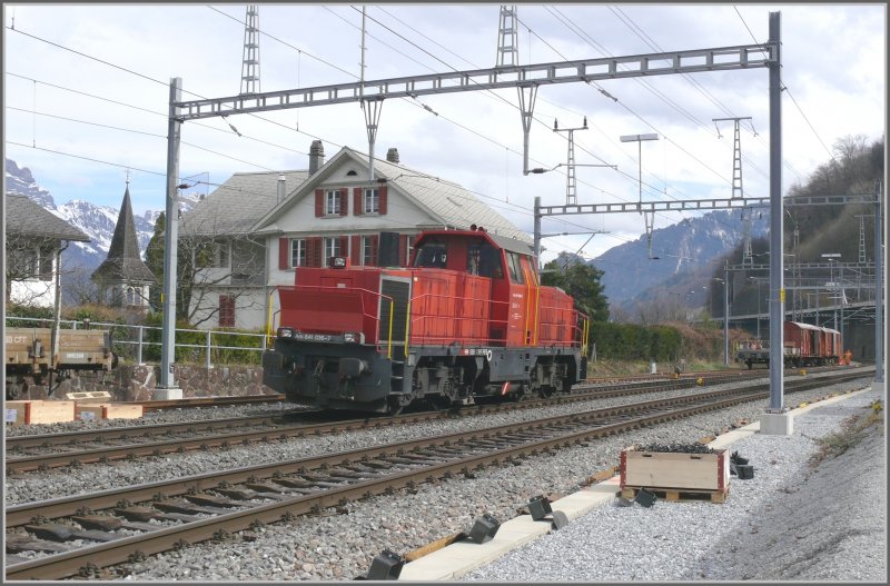 Am 841 036-7 fährt durch den Bahnhof Mühlehorn. Hinter der Lok befindet sich die Umschlagsanlage für Kies und Schotter, die mit dem Schiff von der andern Seeseite herangebracht werden. (10.03.2008)